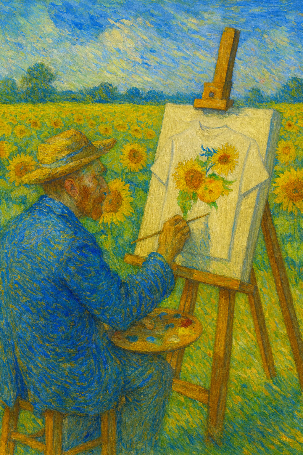 Based on a self-portrait by Vincent van Gogh, this design reinterprets emotional intensity and identity through layered color, texture, and floral elements.