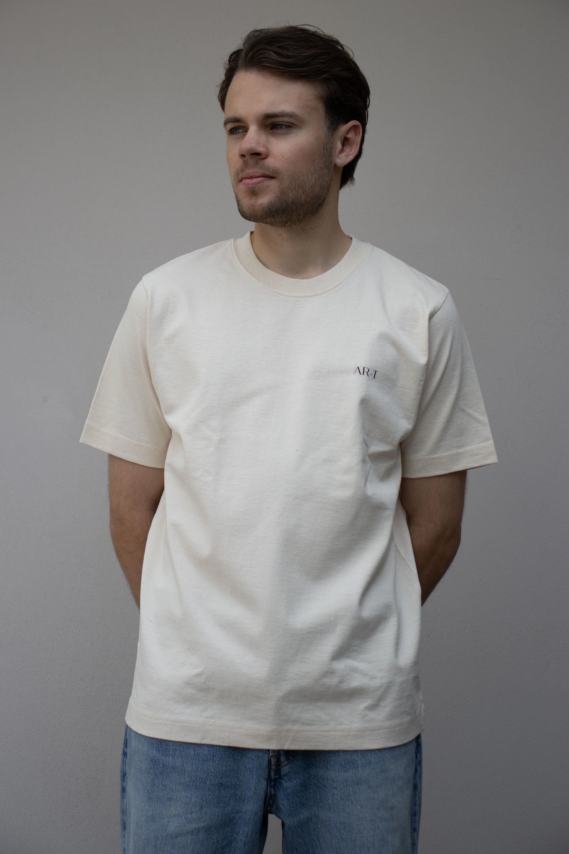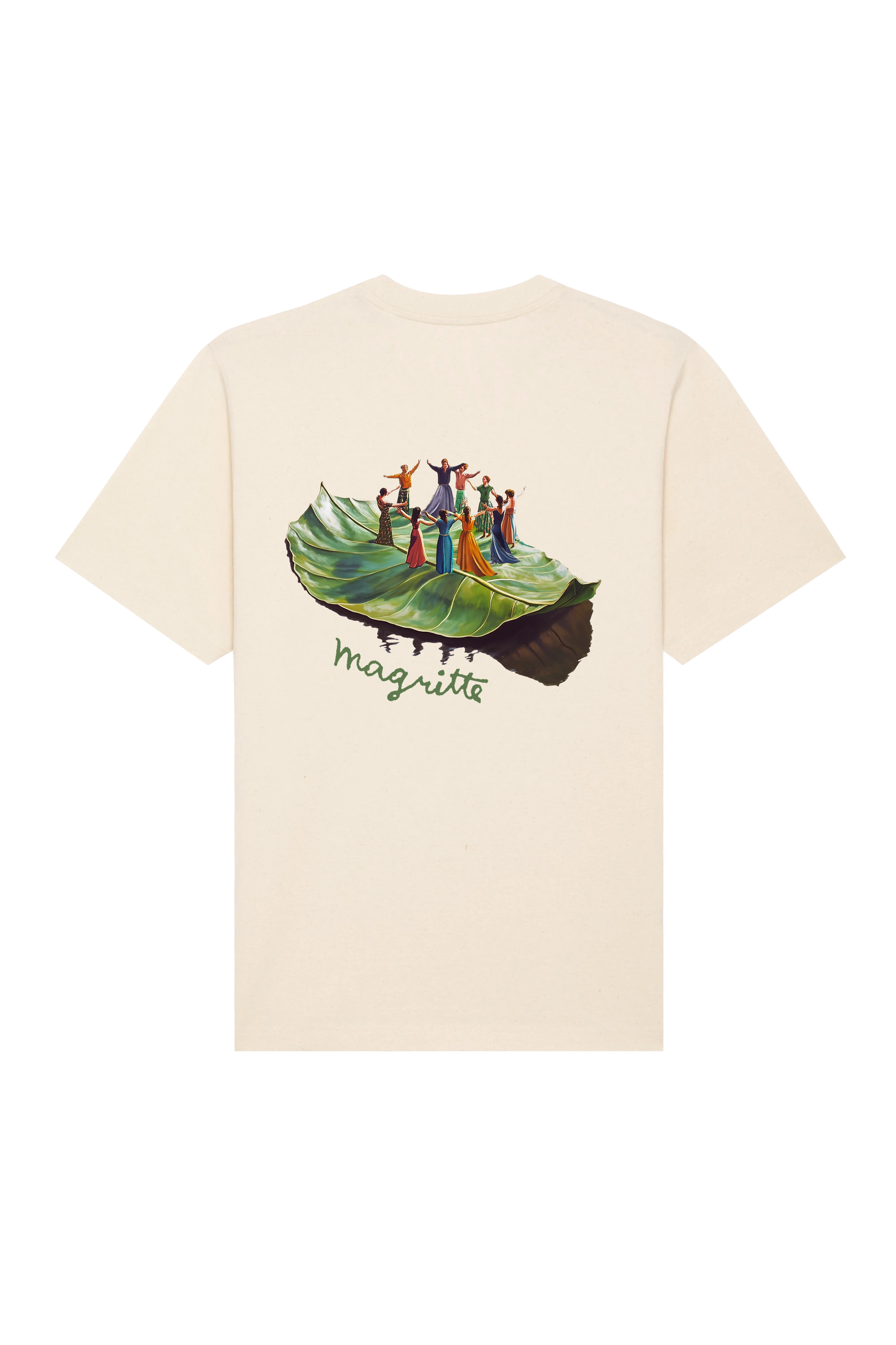 This off-white tee features a surreal scene straight out of a dream: a group of people dancing atop a floating leaf island, suspended in a world that defies logic. Inspired by the visual poetry of René Magritte, the design blurs the line between nature and imagination, with his signature floating just beneath the scene.