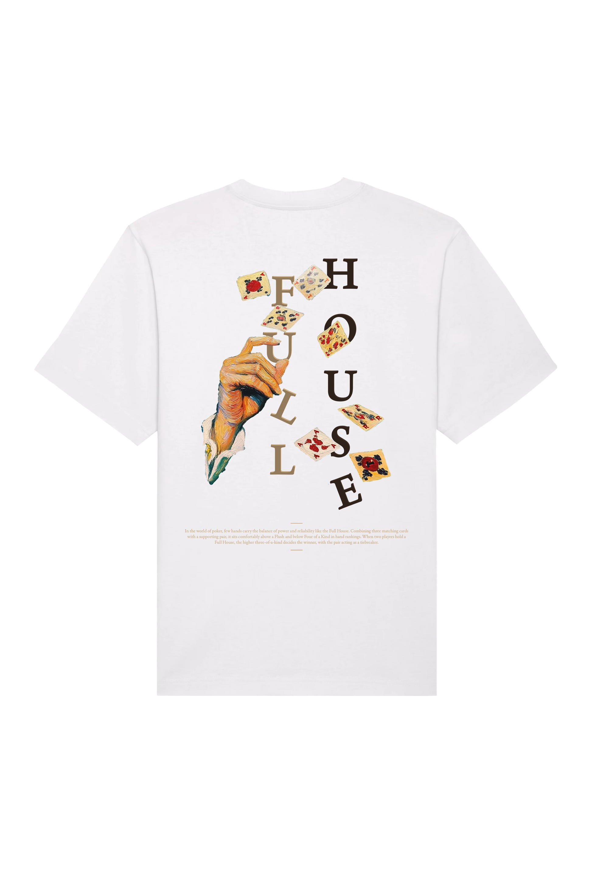 This white tee showcases a Van Gogh-inspired print that merges the expressive energy of post-impressionism with the tension of a winning poker hand. A refined hand tosses playing cards mid-air, spelling out "A-R-T" within a Full House, a clever nod to both the game and the gallery.