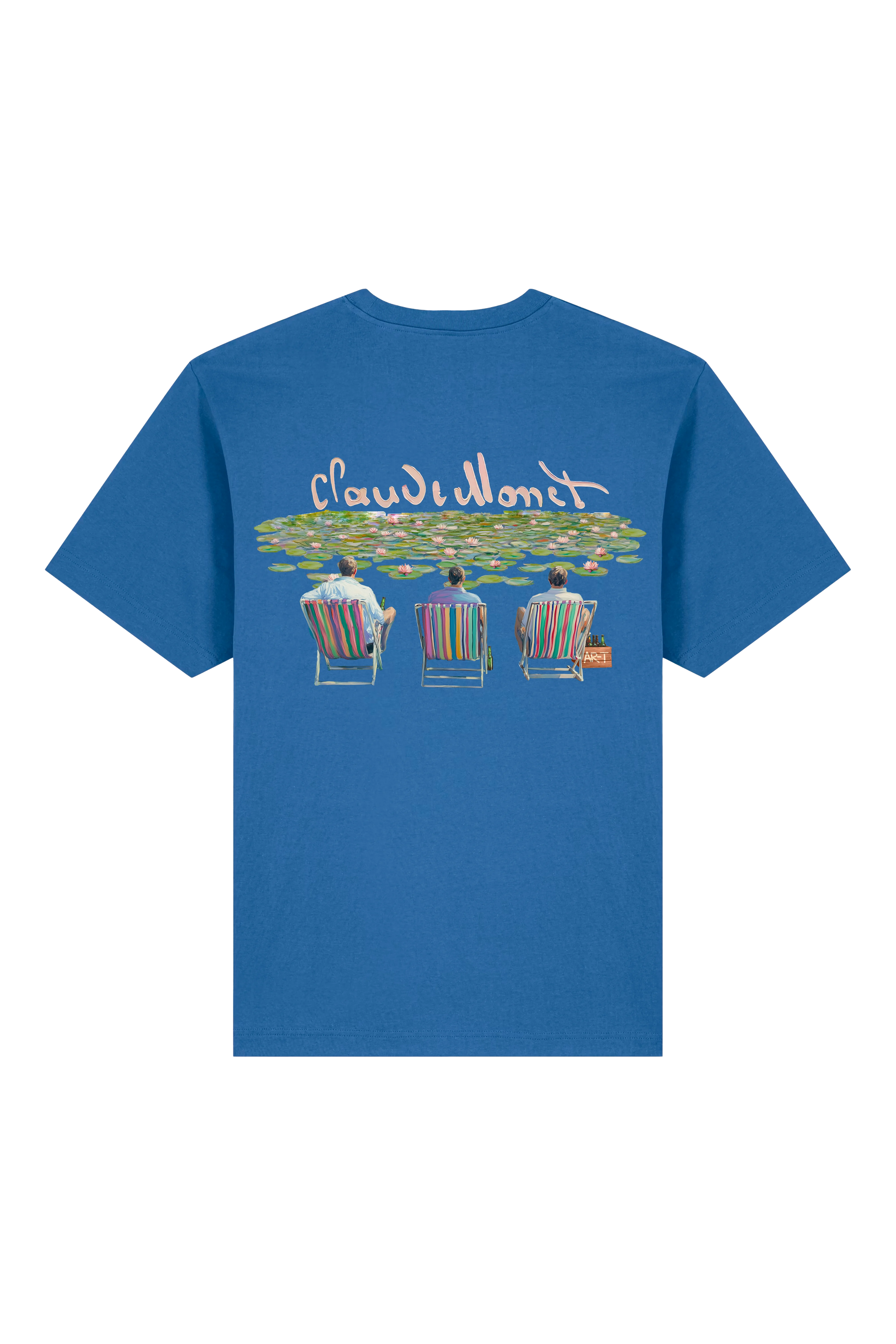 On the back of this Royal Blue t-shirt, three friends sit back in colorful chairs, beers in hand, enjoying the peaceful view of Monet’s iconic lily pond. It's a playful reinterpretation of A Bridge Over a Pond of Water Lilies, bringing the timeless calm of impressionist art together with everyday gezelligheid.